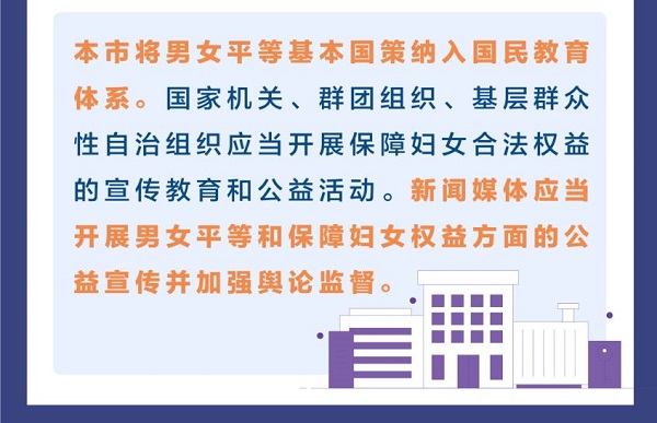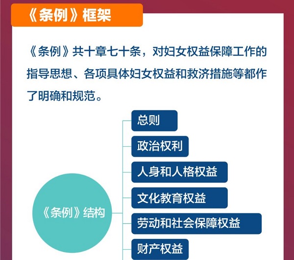《条例》是本市第一次以条例的形式确立保障妇女权益的地方法规,设总则、政治权利、人身和人格权益、文化教育权益、劳动和社会保障权益、财产权益、婚姻家庭权益、救济措施、法律责任、附则共10章70条。