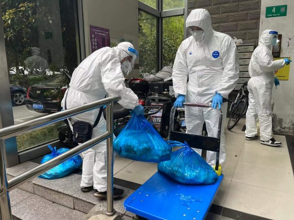 3月底以来,这样的生活几乎成为邵铮的常态。除了线上办公的时间外,邵铮都会把自己裹在厚重的防护服里,从楼下向上搬运一箱箱弥足珍贵的生活物资。
