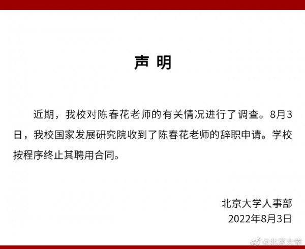 北京大学:收到陈春花辞职申请,按程序终止其聘用合同