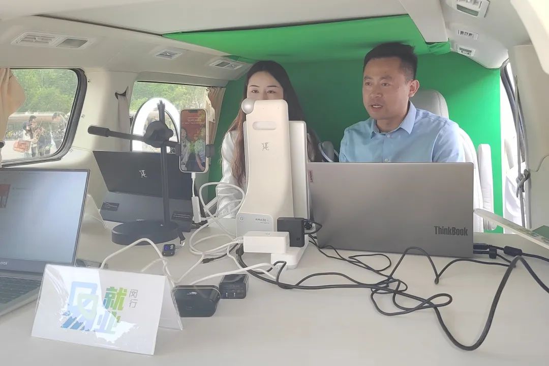 闵行区人社部门还启动了“就业直通车”进校园活动,"就业直通车"是一种创新的招聘工具,由上海创薪集团首发,外观为普通商务车,内部却被改造成一个功能完备的移动演播室,配备齐全的专业直播设备,能够使主播即时启动直播。此车的亮点在于其灵活性与针对性,让求职者近距离走进企业,实现“下楼带岗,上楼收简历”的高效招聘,为企业解决实际招聘需求。活动通过岗位直播、就业指导、职业训练营等多种形式,助力大学生实现高质量就业。