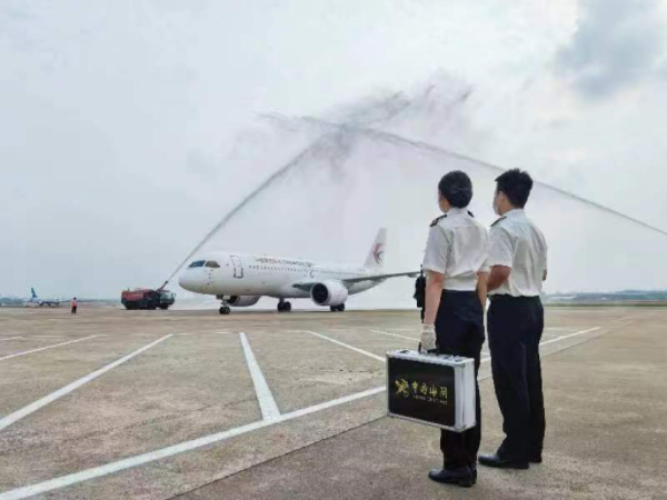 新民晚报讯 (记者 郭剑烽)昨天(1日)下午,由东航执飞的C919国产大飞机从中国香港抵达上海虹桥国际机场。伴随着轰鸣的引擎声,航班平稳降落、穿过“水门”,120余名参加“沪港同心”交流活动的香港大学生如期而至。