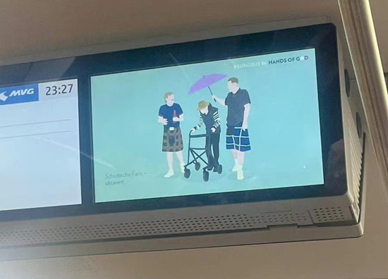 小组赛第二轮后,在德国各地乘坐地铁的球迷,会在车厢里看到一幅特别的手绘:两位身材高大的小伙子,为一位行动不便的老年人撑起一把伞挡雨。许多特意赶来赛地的球迷看到这样的作品,都忍不住拍照留念,更会为画中的年轻人点赞。