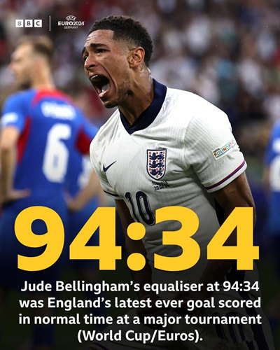 对于目前效力于皇马的天才球员贝林厄姆来说,这将是属于他的一届欧锦赛——可以说,是他凭借一己之力挽救了星光四射的三狮军团。上一届欧锦赛杀入决赛的英格兰队,本届也是夺冠大热门,全队身价高居第一,特别是中前场拥有众多顶级球员,被人寄予厚望。不过英格兰队在小组赛中的表现,配不上他们的身价,还好他们有贝林厄姆。今晨的淘汰赛,英格兰队开场后率先丢球,之后长时间没能敲开对手大门,眼看着即将被爆冷淘汰,贝林厄姆又挺身而出,在距离比赛结束仅剩1分钟时攻入扳平球,然后才有了加时赛凯恩的进球和英格兰队的胜利大逃亡。