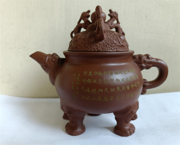 (珍藏至今的延安紫砂壶。三足鼎式,壶盖三翼龙形。壶身小,蓄水少,礼器造型。延安新华陶瓷厂出品,厂长常启秦。本文作者供图)