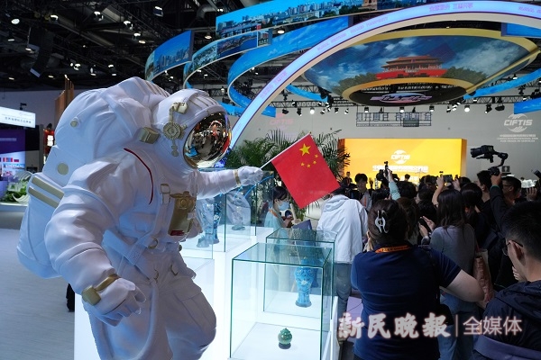 椰林树影的主宾省海南省展区中,观众可以看到南海沉船遗址中打捞的精品文物复制件,以及文昌发射的“长征五号”运载火箭模型。海南省商务厅服务贸易处处长李鹏介绍:“从服务贸易领域来说,海南已经具备了卫星商业发射的能力,未来我们会打造火箭链、卫星链、数据链三链合一的卫星商发产业体系,这也是数字贸易里的重要一环。”