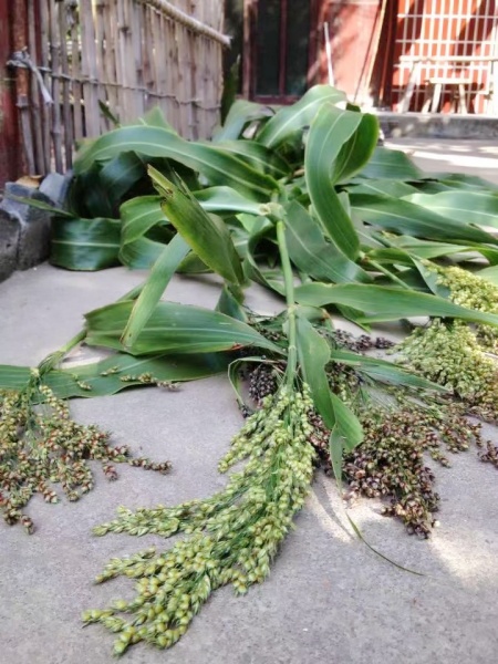 不久,有了联系的战友小黄诚心邀请我去他的家乡崇明岛小住两日。下了船,他骑自行车接我。乡间的机耕路十分颠簸,坐在自行车后座如同骑马。但一片片金黄的稻子和一丛丛高昂的芦穄令我兴奋不已。战友的家东边是清静的河道,西边是起伏的稻田。河边一长溜亭亭玉立的芦穄微微摆动着沉甸甸的紫红色穗子,仿佛是欢迎我的到来。战友好像知晓我心思,一进家门就拿上砍刀去斩了十几棵芦穄横放到门前场地,再一一扯下条状叶子,去头斩根,边截下秸秆,边递给我说:“这时的芦穄最甜。”我接连吃了好几节,吐出的碎渣落在地上很快引来了一群蚂蚁。他看我吃得酣畅,又欣然说:“这东西通气解渴清火健脾,吃不坏肚子。而且极易生长,春天下了苗就不用再管它,岛上的人家都种植。”难怪所见人家的房前房后、田边沟沿都有一片片一行行旗帜般摇曳的芦穄。自此以后,每到芦穄成熟时,战友要么请我去崇明乡下,要么送来一大捆,好让我过足瘾。