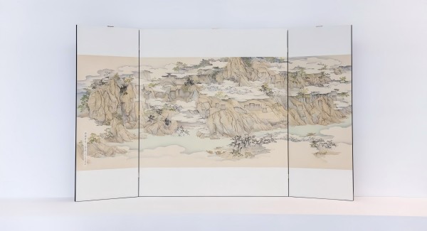 储嘉的画作《旃檀海·无上清凉》通过三面屏的形式,以实地写生为蓝本,呈现了杭州飞来峰石窟造像群的壮丽景观。作品采用绢本设色技法,画面中飞来峰周围的奇石怪树,与各个朝代的仕女在山水之间的交游,传递出一种幽远宁静的意境,展示了年轻的创作者对传统文化与自然景观的深入理解与再现。