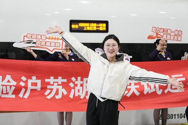 湖州市区域合作办副主任沈鑫钰今天也特意赶来试乘试运行列车,她说:“沪苏湖高铁是湖州翘首以盼的新通道。对于湖州而言,这不仅是一条高铁,更是一条承载着高质量发展期望的路。沪苏湖高铁的开通,使西向大通道进一步打开,将有效提升上海辐射长三角内陆腹地的龙头带动效应,而湖州正处于这条重要通道的枢纽节点位置,我们也将在长三角区域整体高质量发展的过程中努力实现自己的赶超之梦。”