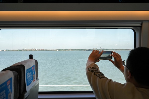 今日秋高气爽,坐在试运行列车上,望着车窗外的江南秋色,令人心旷神怡,尤其是列车经过元荡湖段,列车在湖面上的高架高铁线上飞驰,人在风景画里游。