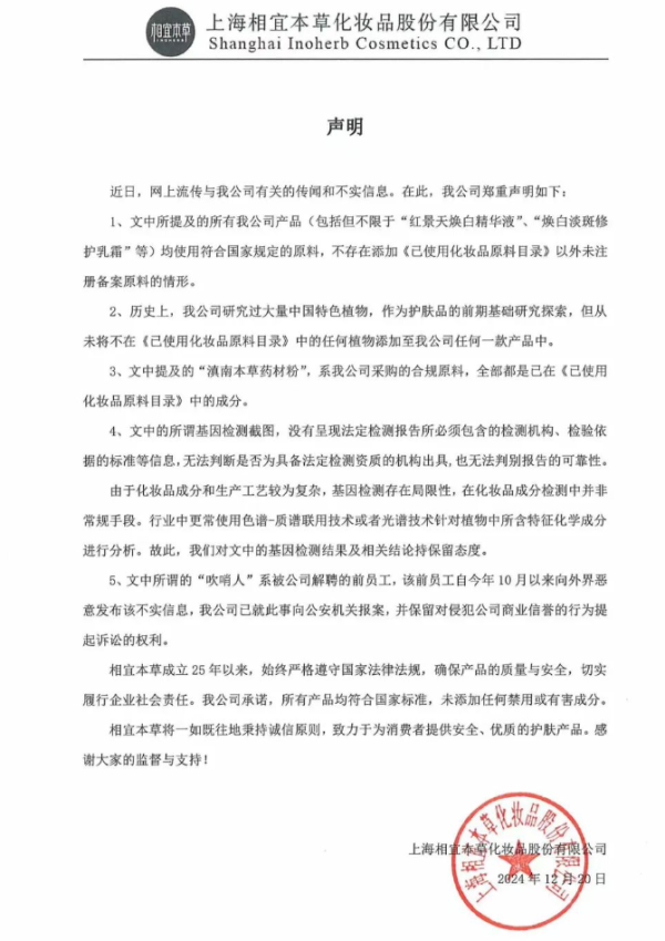 相宜本草表示,“该文中所谓的‘吹哨人’系被公司解聘的前员工,该前员工自今年10月以来向外界恶意发布该不实信息,公司当时已就此事向公安机关报案。我们也将保留对侵犯公司商业信誉的行为提起诉讼的权利。”