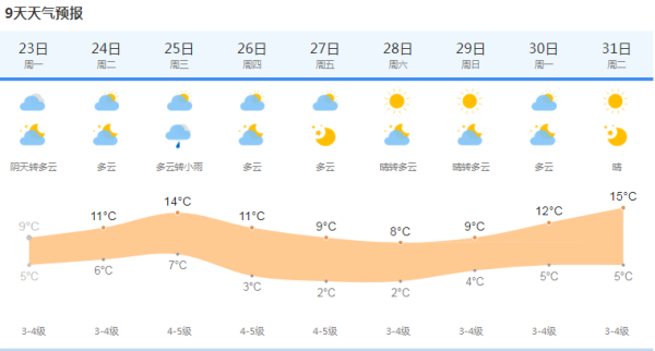 具体预报:阴到多云,最高气温9℃,局部地区有短时小雨,偏北风4~5级。 温馨提示:气温虽略有回升,不过仍处低位,体感寒冷,继续做好防寒保暖措施;干燥有所缓解。