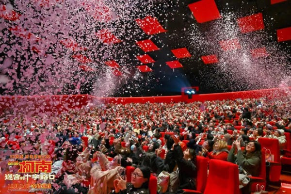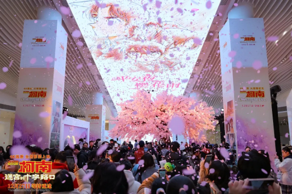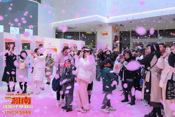 12月24日,《名侦探柯南:迷宫的十字路口》在上海举办了樱花雨首映礼。午夜时分,伴随着仓木麻衣那熟悉而动人的《Time after time~在落花纷飞的街道上~》的旋律响起,全国首场零点樱花雨在上海影城一号厅浪漫而至。那纷纷扬扬飘落的樱花,如同电影中所描绘的浪漫场景一般,在现实中得以重现,让现场上千名观众仿佛置身于电影之中,与平和、新兰一同感受着那份纯爱与浪漫。影片还将在12月31日跨年夜22:17于全国开启限量樱花雨场,约喜欢的人一起看,让漫天的樱花替你告白。